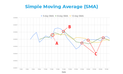 The one under consideration here is SMA. Traders who use these as their main indicators will look at multiple period frames such as the 4 and 9 or 5, 10, and 20 period moving averages.