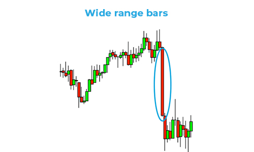 Wide range bar is a candle or bar that is 2 to 3 times longer than the others on the chart showing that major price action took place during that period. It also indicates that there was a large amount of force or momentum behind this price action.